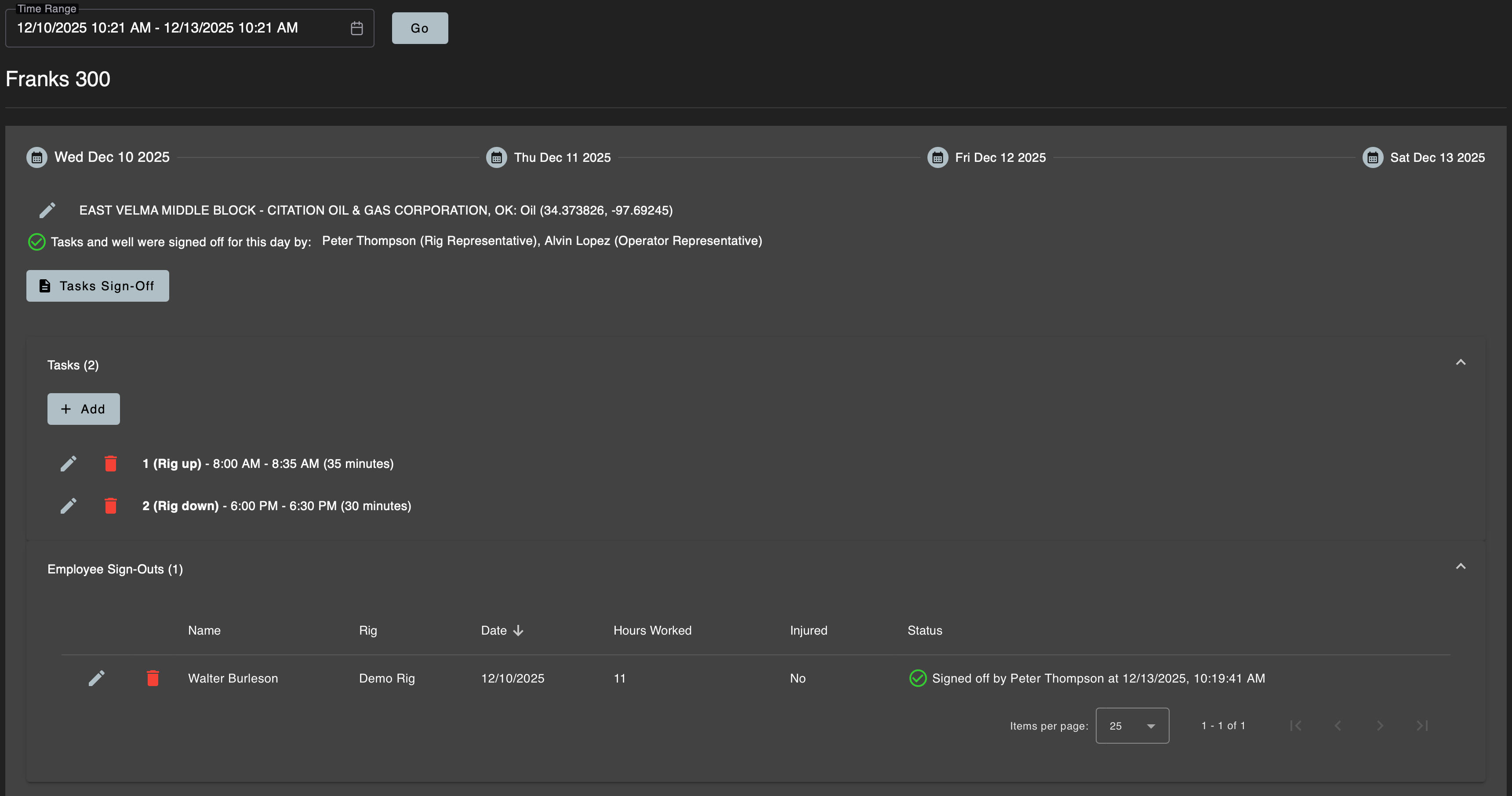 Crew members clock out on their phones or on a tablet at the rig. If someone gets hurt — they report it in the system. The safety lead has the ability to approve, and the incident becomes part of the permanent record. No more lost forms or discrepancies.
